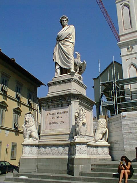 The statue is in front of the Basilica di Santa Croce (Church of the Holy Cross), where Dante and other famous Florentines and other Italians are buried or memorialized: Michelangelo, Machiavelli, and Galileo have tombs there, and monuments to the scientists Marconi and Fermi stand beside one to da Vinci. The front of the church had been refaced in red, white, and green marble at the time the little kingdoms, duchies, city-states, and what-have-you were united by Garibaldi to create Italy as a nation in the middle of the 19th century; red, white, and green are, of course, the colors of the Italian flag. Florence was actually the first capital of the nation, because it took some time to persuade the Pope to accept reduced secular authority and to rule only Vatican City, not all of Rome; the capital was moved to Rome in the early 1870's and the arrangement with the Pope was finalized by treaty only in the 1920's, I think.
